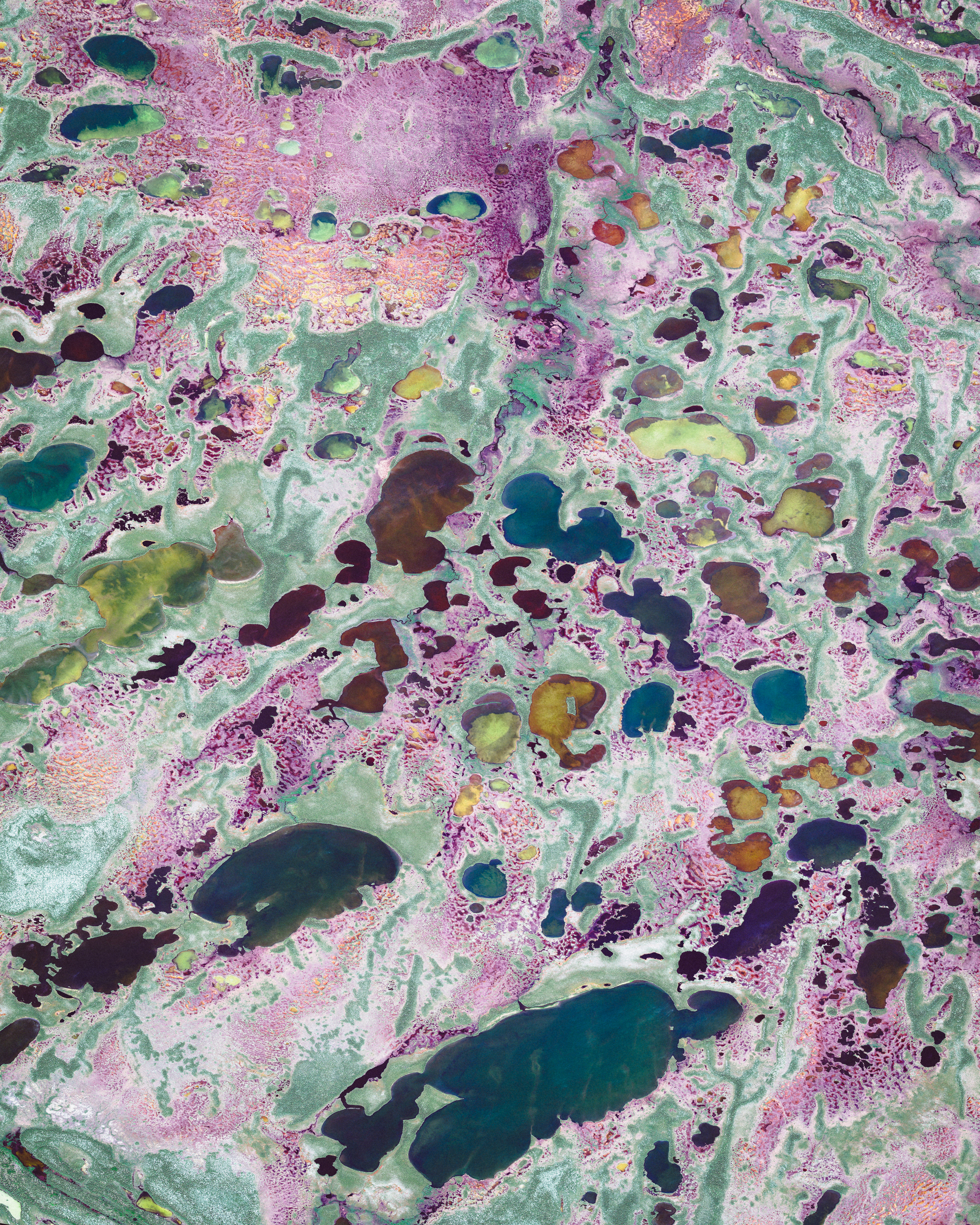 Akimiski Island is the largest island in James Bay (a southeasterly extension of Hudson Bay), Canada. Most of the vegetation covering the island consists of lichen, moss, sedges and black dwarf spruce, giving it a vibrant color scheme from the aerial perspective. The island has no year-round human inhabitants; however, it is home to the 1,300-square-mile (3,367-sq-km) Akimiski Island Migratory Bird Sanctuary.