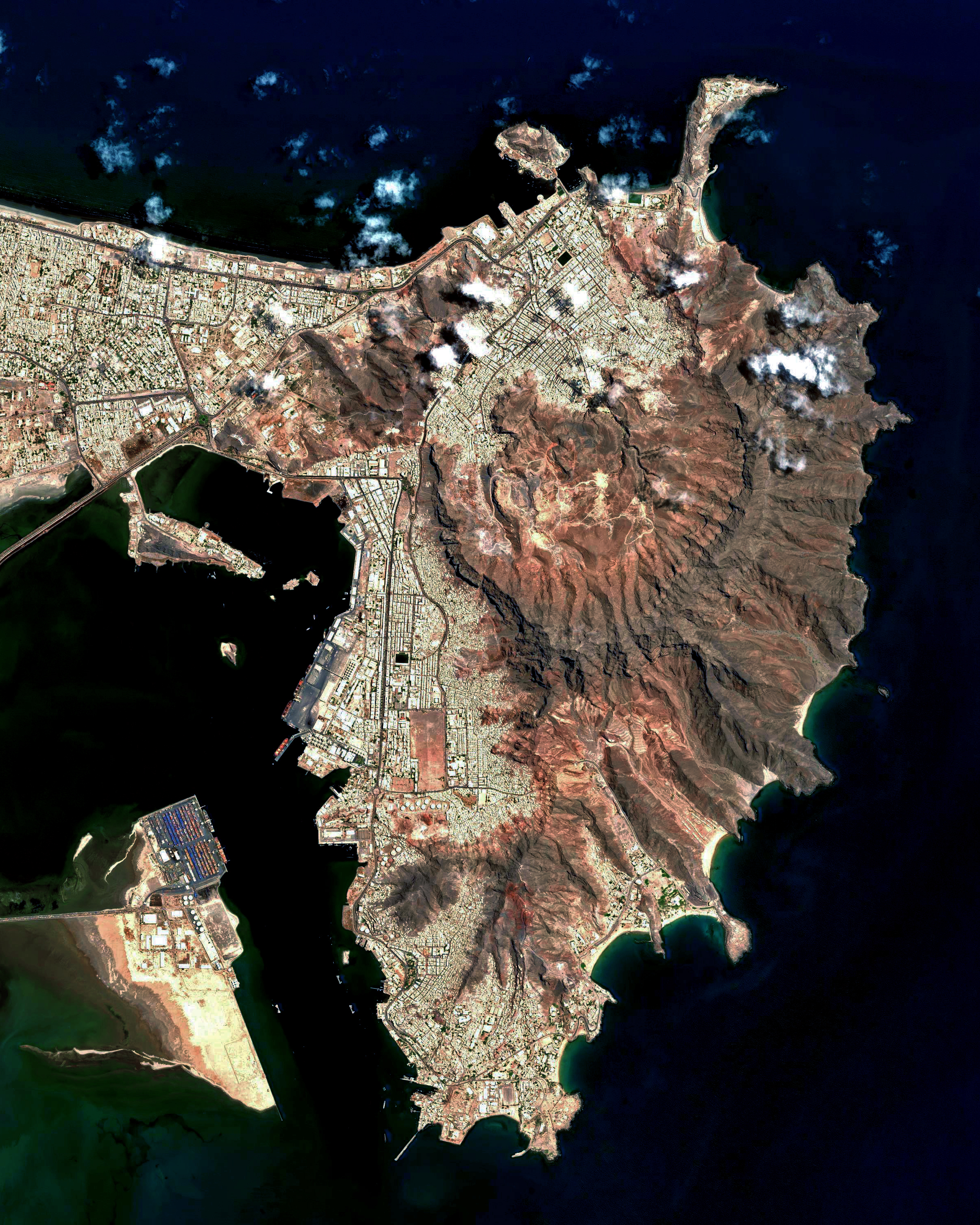 Aden is one of the most populous cities in Yemen, with more than 1 million residents. Its natural harbor lies in the crater of a dormant volcano, which now forms a peninsula joined to the mainland by a low isthmus. The city is situated on the eponymous Gulf of Aden, near the eastern approach to the Red Sea.