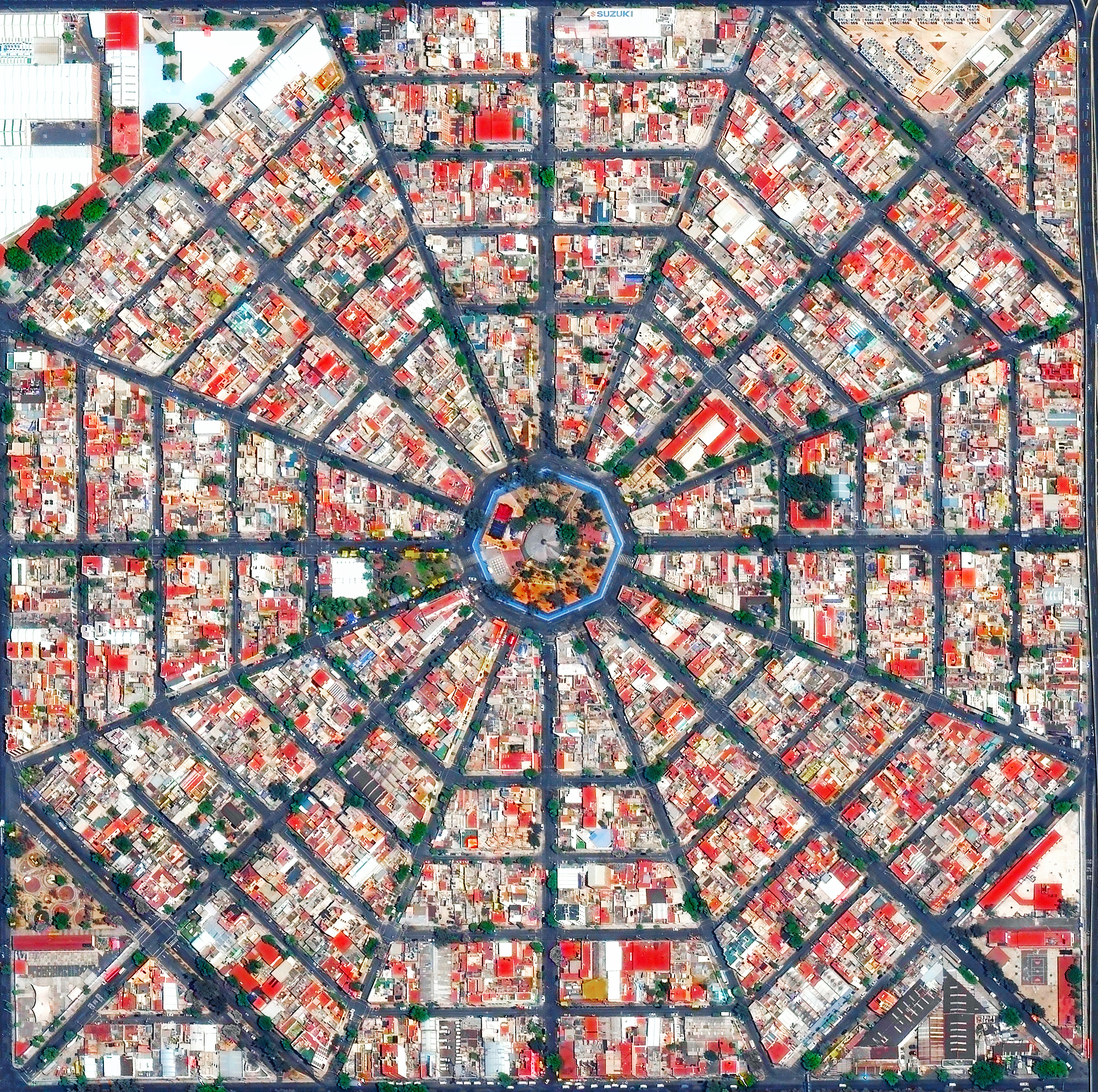 Radiating streets surround the Plaza Del Ejecutivo in the Venustiano Carranza district of Mexico City, Mexico. This district — which is home to more than 440,000 people — contains three of Mexico City’s large traditional markets: La Merced, Mercado de Sonora, and Mercado Jamaica.