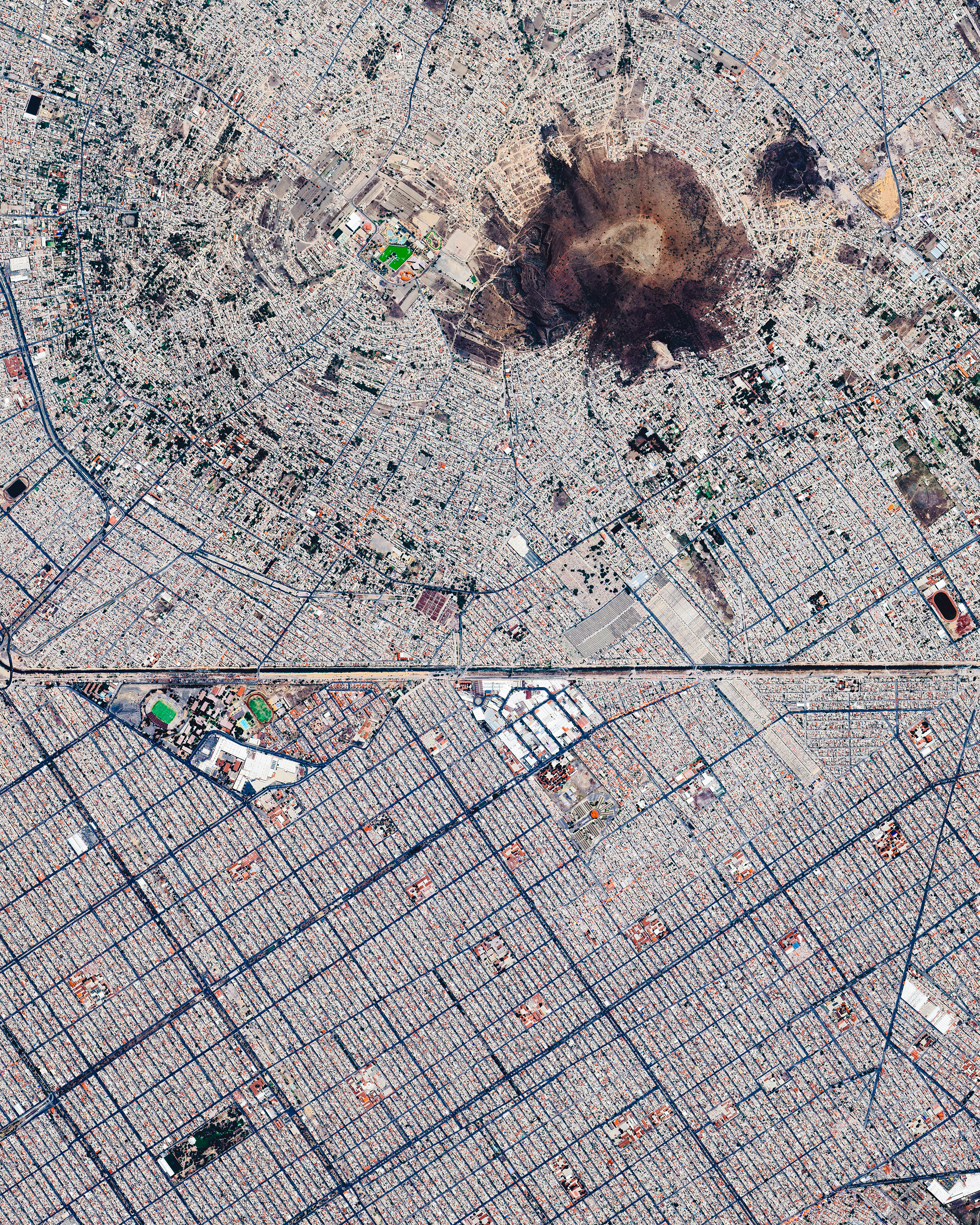 Chimalhuacán (top) and Ciudad Nezahualcóyotl are two municipalities in Greater Mexico City, with a combined population of nearly 1.8 million. Nezahualcóyotl is characterized by its long, straight, and gridded streets, while Chimalhuacán is arranged in a mostly radial pattern around the slopes of Cerro Chimalhuache. The two are separated by a canal of the Río de la Compañía.
