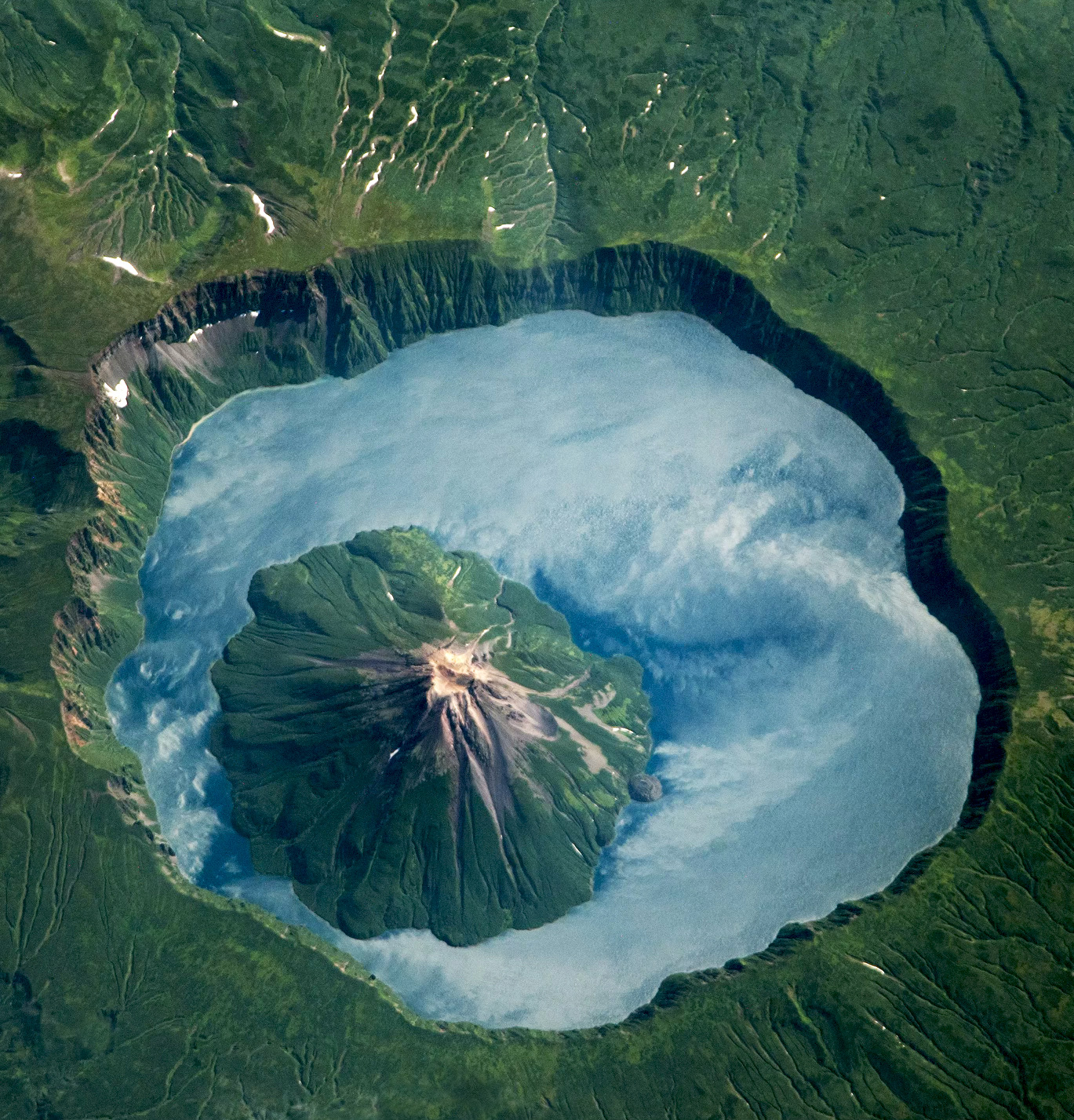 The peak of Krenitsyna Volcano rises as an island within an island in Russia's Far East. It is located on Onekotan Island in the northwest Pacific Ocean and surrounded by Kol'tsevoye Lake, a 4.6-mile-wide (7.5-km) caldera lake. Onekotan is part of the Kuril Islands, a volcanic archipelago and segment of the “Ring of Fire” — a path of tectonic activity that circles the Pacific Ocean.