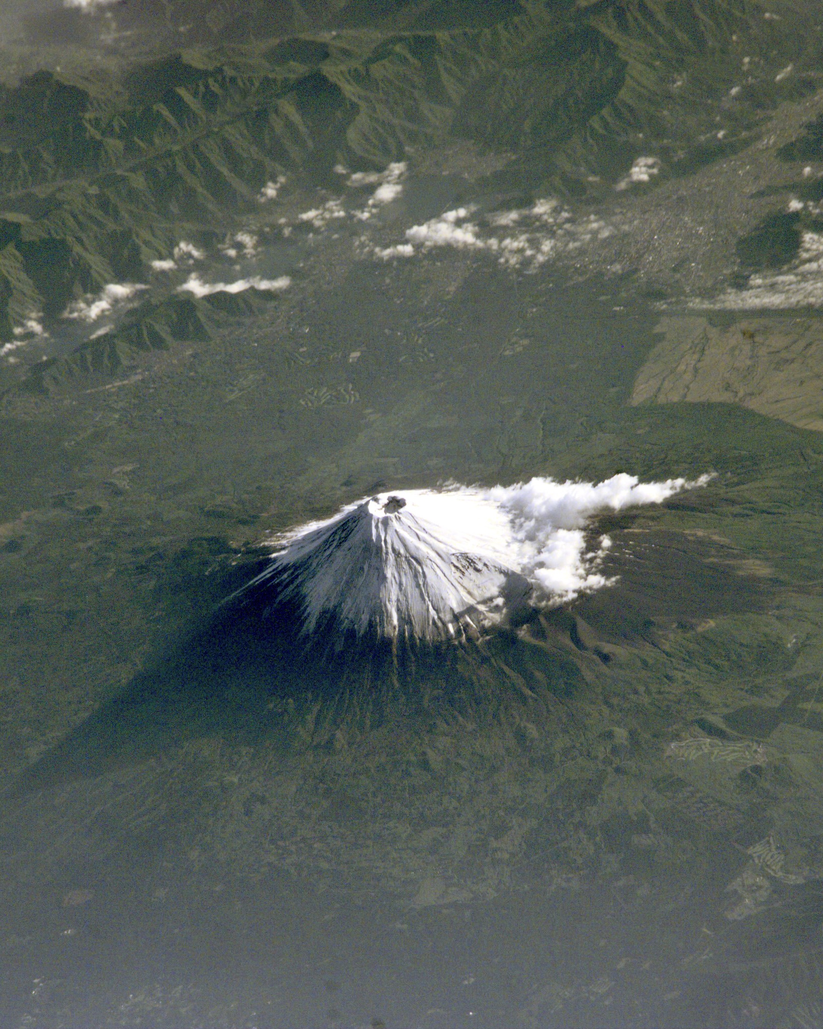 Mount Fuji, Japan, as seen from the International Space Station. An active stratovolcano and the tallest peak in Japan at 12,389 feet (3,776 m), Fuji has an extremely symmetrical cone that is snow‑capped for several months of the year. During warmer months, climbing routes make it possible for hundreds of thousands of people to hike the summit each year.