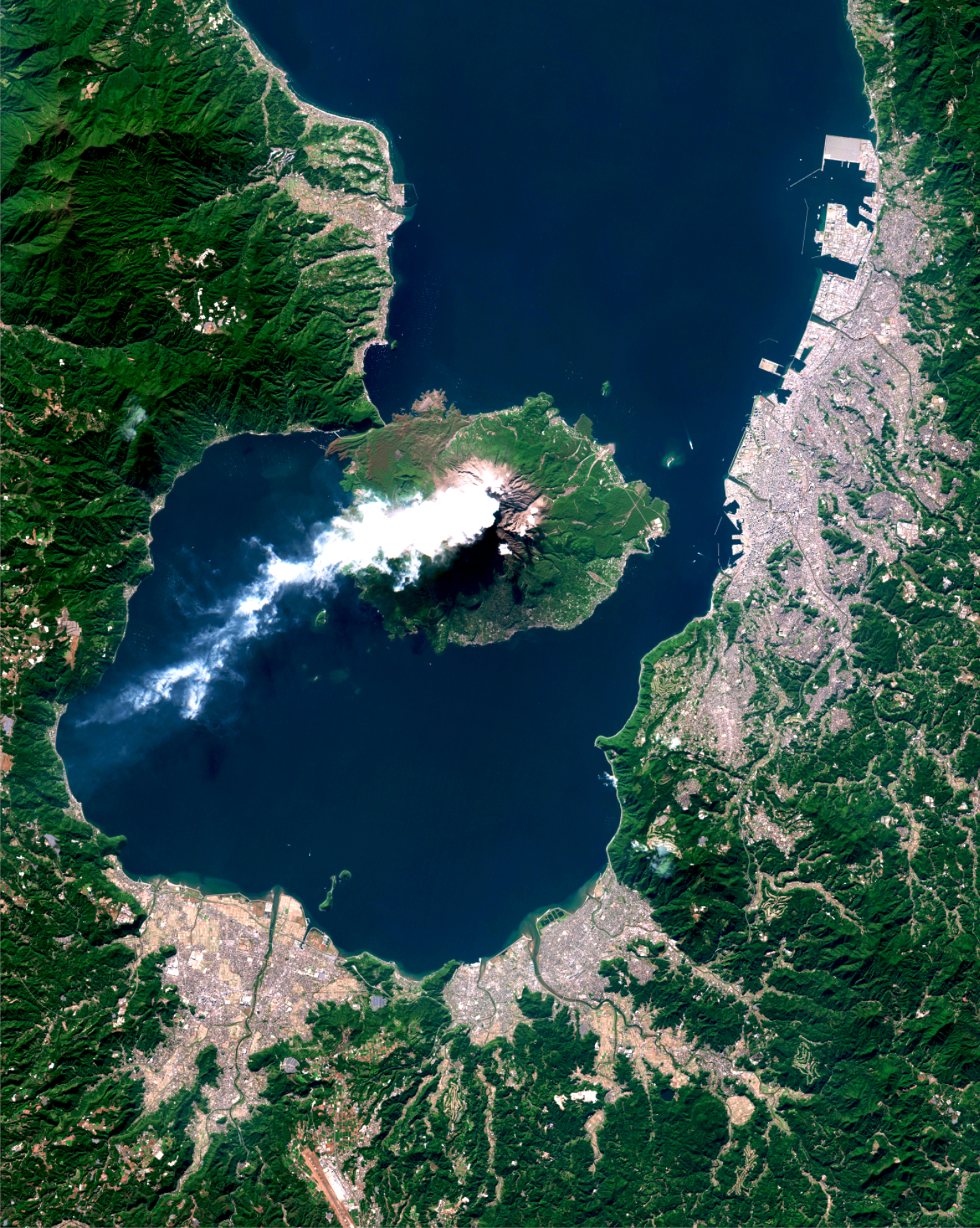 Sakurajima, an active stratovolcano in Kyushu, Japan, was once an island until lava flows from its massive 1914 eruption connected it to the Osumi Peninsula (seen at left in this Overview). Since 1955, it has been in a near-constant state of eruption, producing thousands of small explosions each year. Just 8 km (5 mi) away, the city of Kagoshima—home to more than 600,000 people—is one of the largest urban centers in such close proximity to an active volcano.