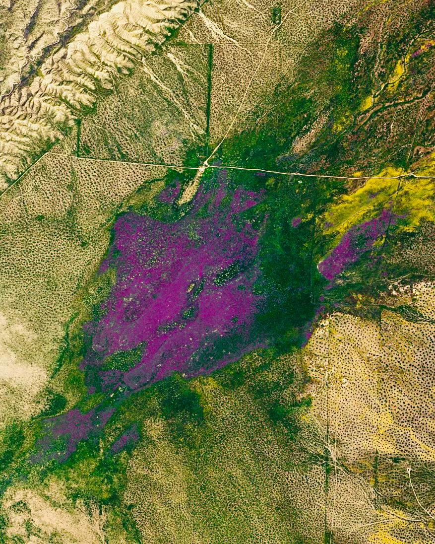 A superbloom of wildflowers blankets the Carrizo Plain in Southern California. This phenomenon, which follows an unusually wet season in California, occurs when a high proportion of wildflower seeds that have lain dormant in desert soil germinate and blossom at roughly the same time. Common plant species involved are brittlebush (yellow flowers), California poppies (bright orange), and lupine (purple).