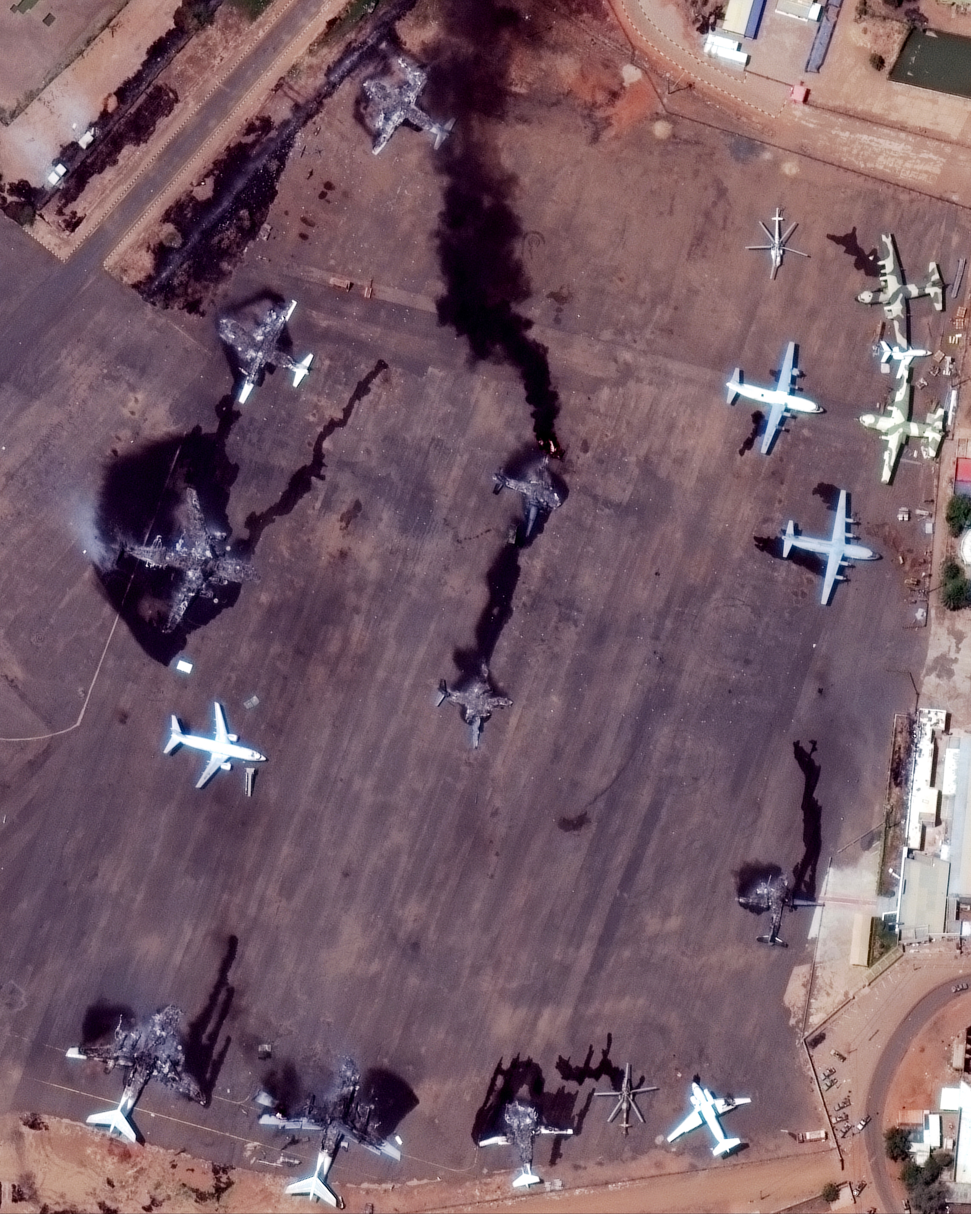 Khartoum, the capital city of Sudan, has been gripped by violence for days as rival Sudanese military factions battle for control. This Overview shows numerous airplanes destroyed or damaged at Khartoum International Airport on Monday, April 17th. At least 270 people have been killed and more than 2,600 injured in the unrest.
