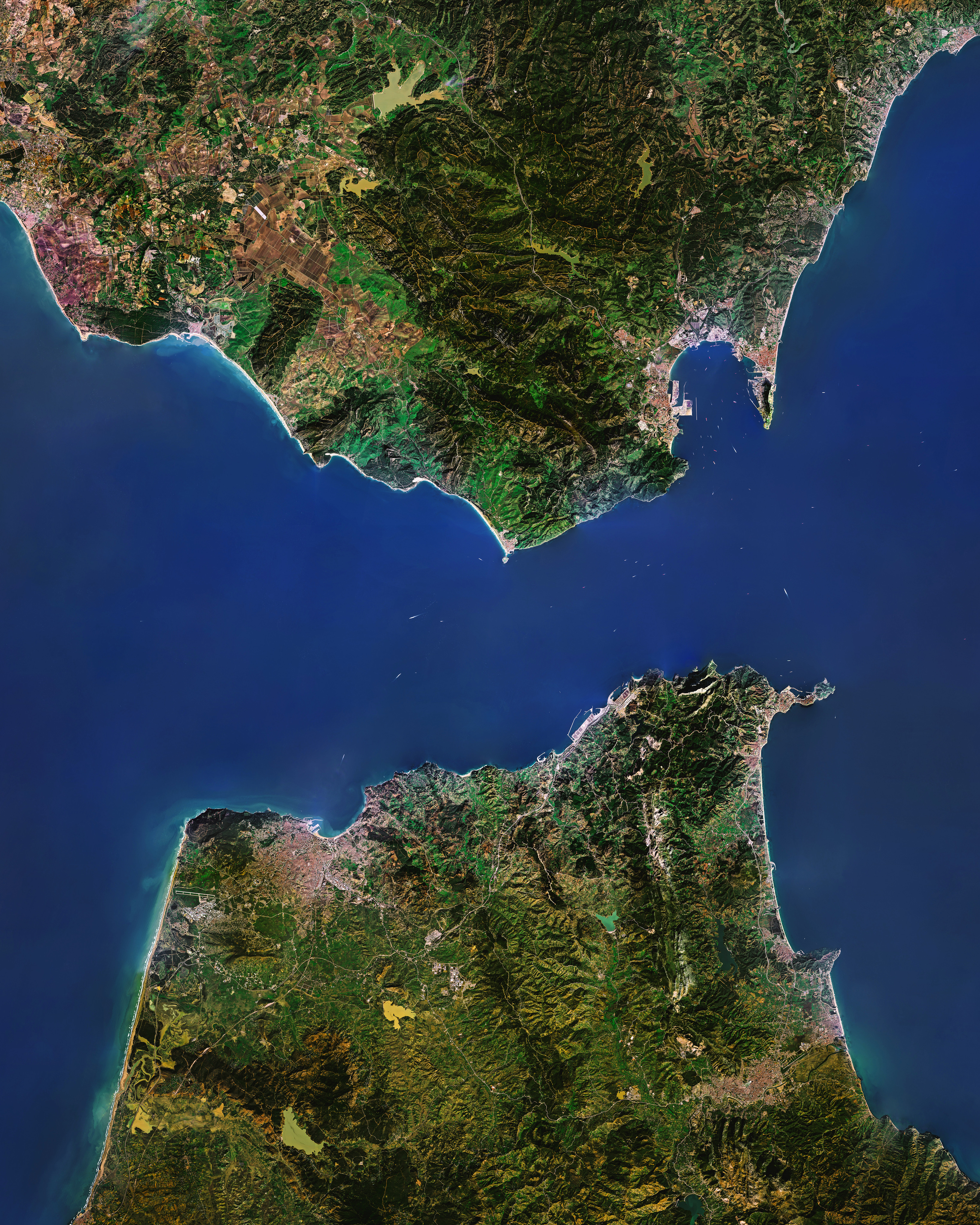 The Strait of Gibraltar is a narrow channel that connects the Atlantic Ocean to the Mediterranean Sea and separates the Iberian Peninsula in Europe from Morocco in Africa. It is 36 miles (58 km) long and just 8 miles (13 km) across at its most narrow point. Around 300 ships cross the Strait of Gibraltar each day — about one ship every five minutes.