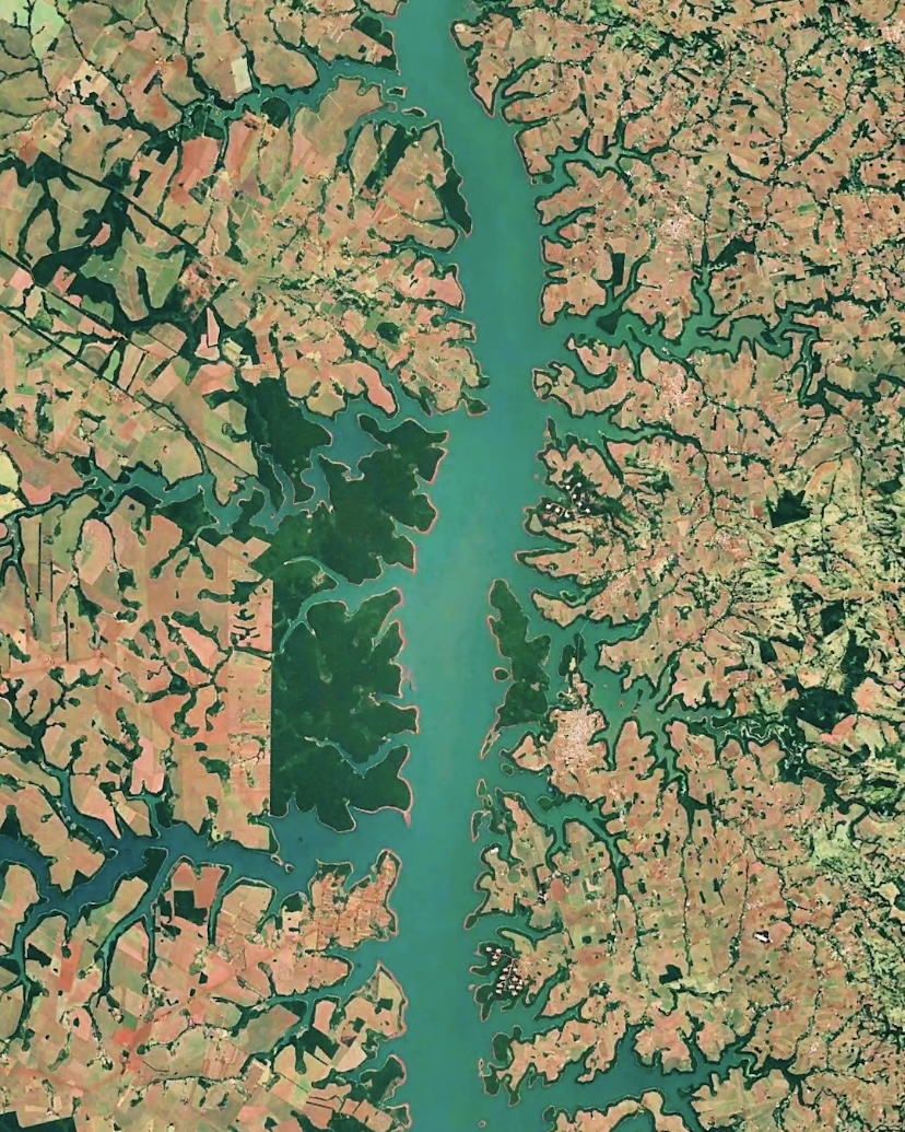 The Paraná River flows for some 3,030 miles (4,880 km) in south-central South America, running through Brazil, Paraguay, and Argentina. The section of the river seen here forms the border between Brazil (right) and Paraguay (left). This Timelapse also shows years of deforestation in Paraguay, where 15.5 million acres (6.2 million hectares) of tree cover has been lost between 2001 and 2019.