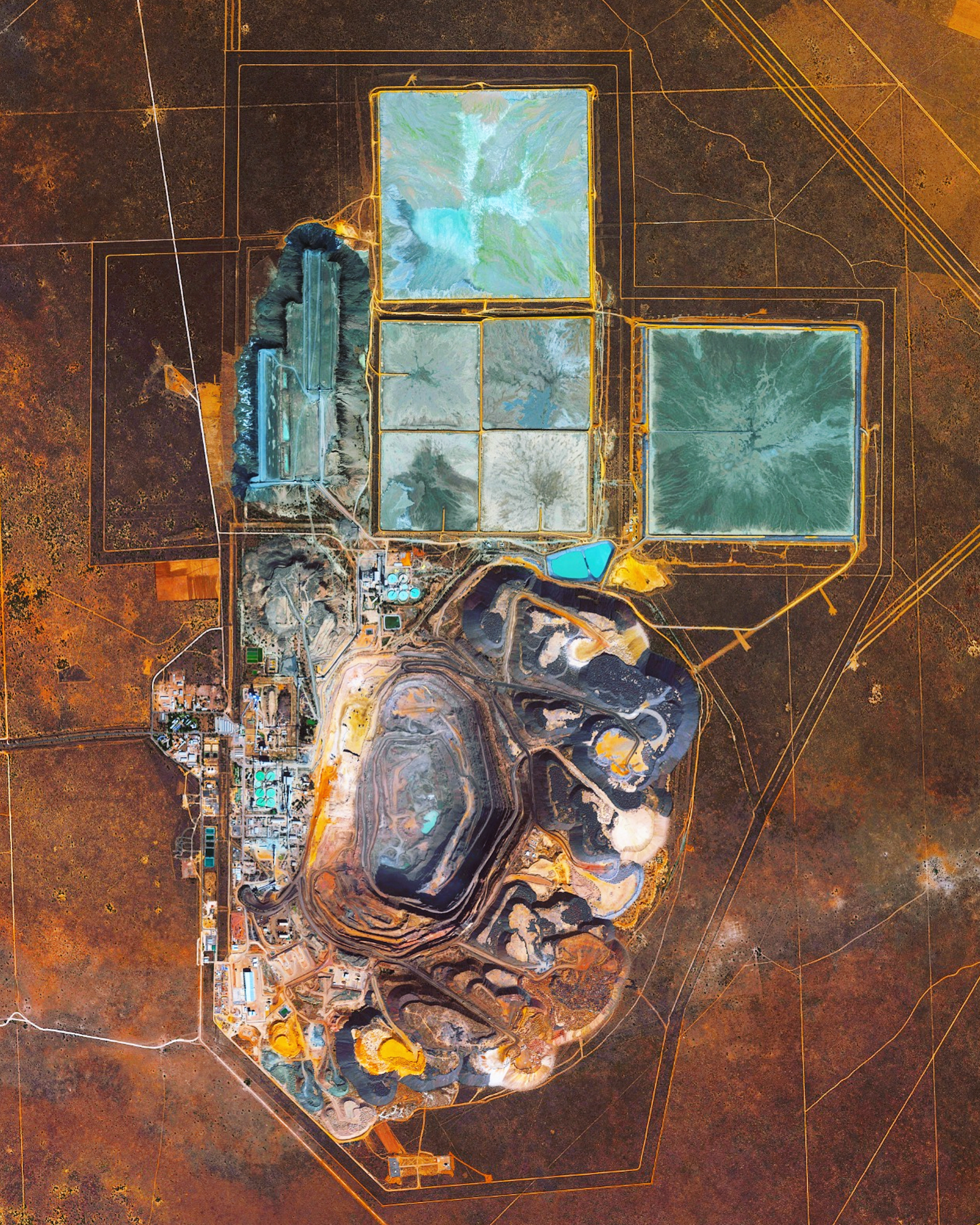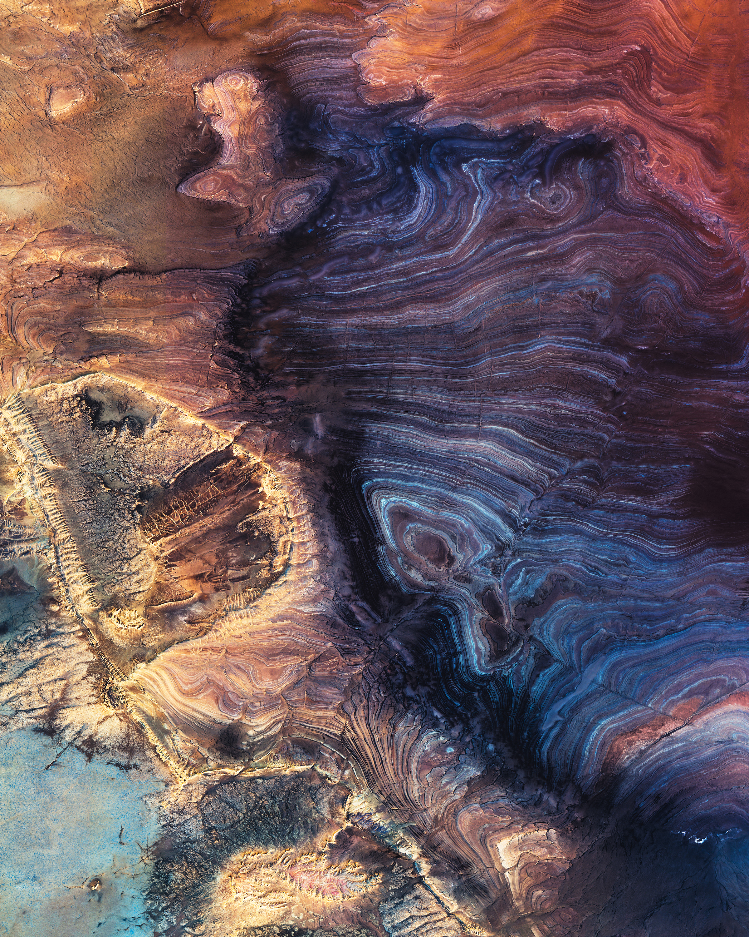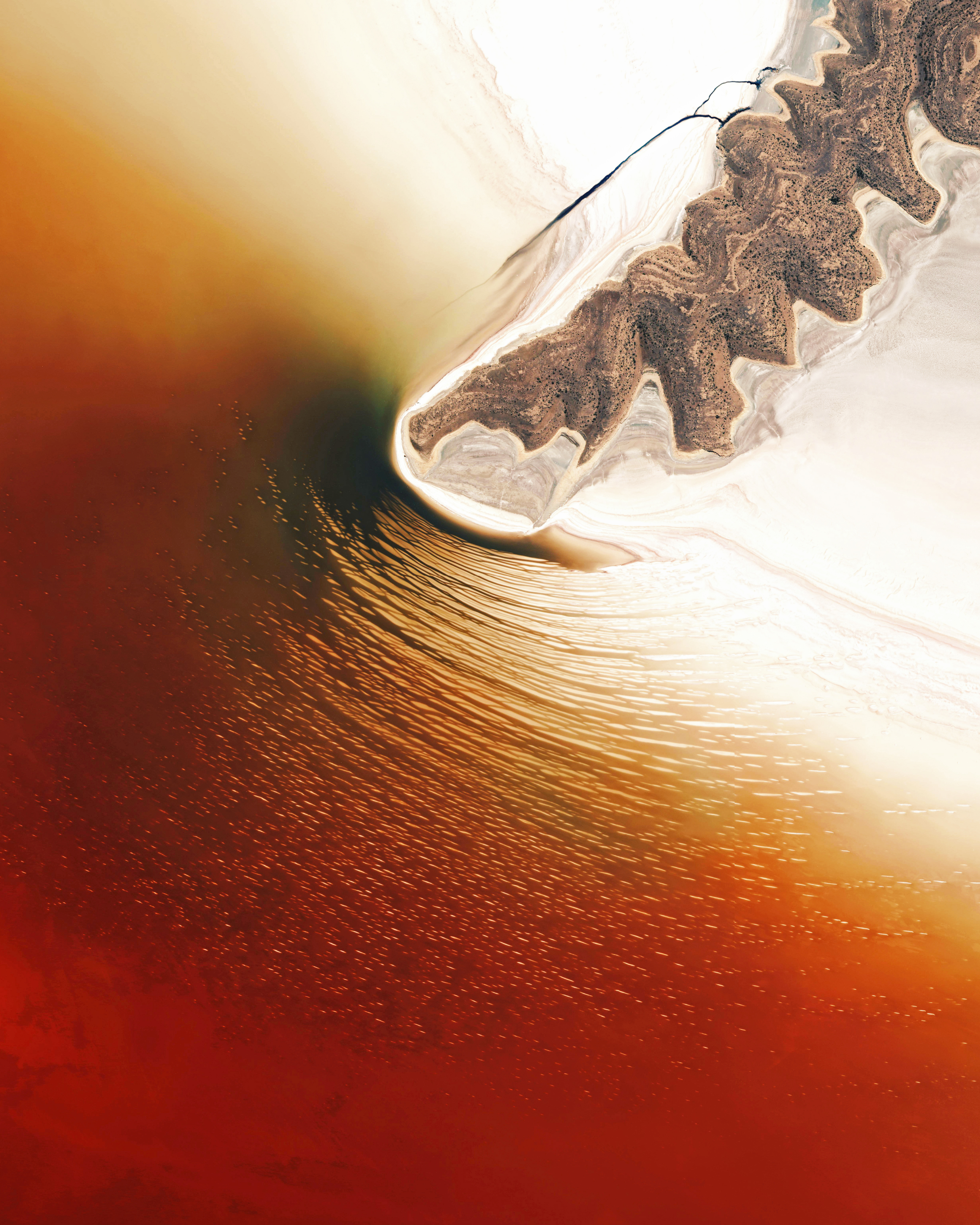 Lake Urmia is an endorheic salt lake in northwestern Iran. It was once the sixth-largest saltwater lake on Earth with a surface area of 2,000 square miles (5,200 square km), but by 2017 had shrunk to 10% of its original size due to drought and damming of inflow rivers. The lake’s red-orange color comes from a high concentration of halophiles, or “salt-loving” bacteria and algae, which have pigments ranging from pink to deep red.
