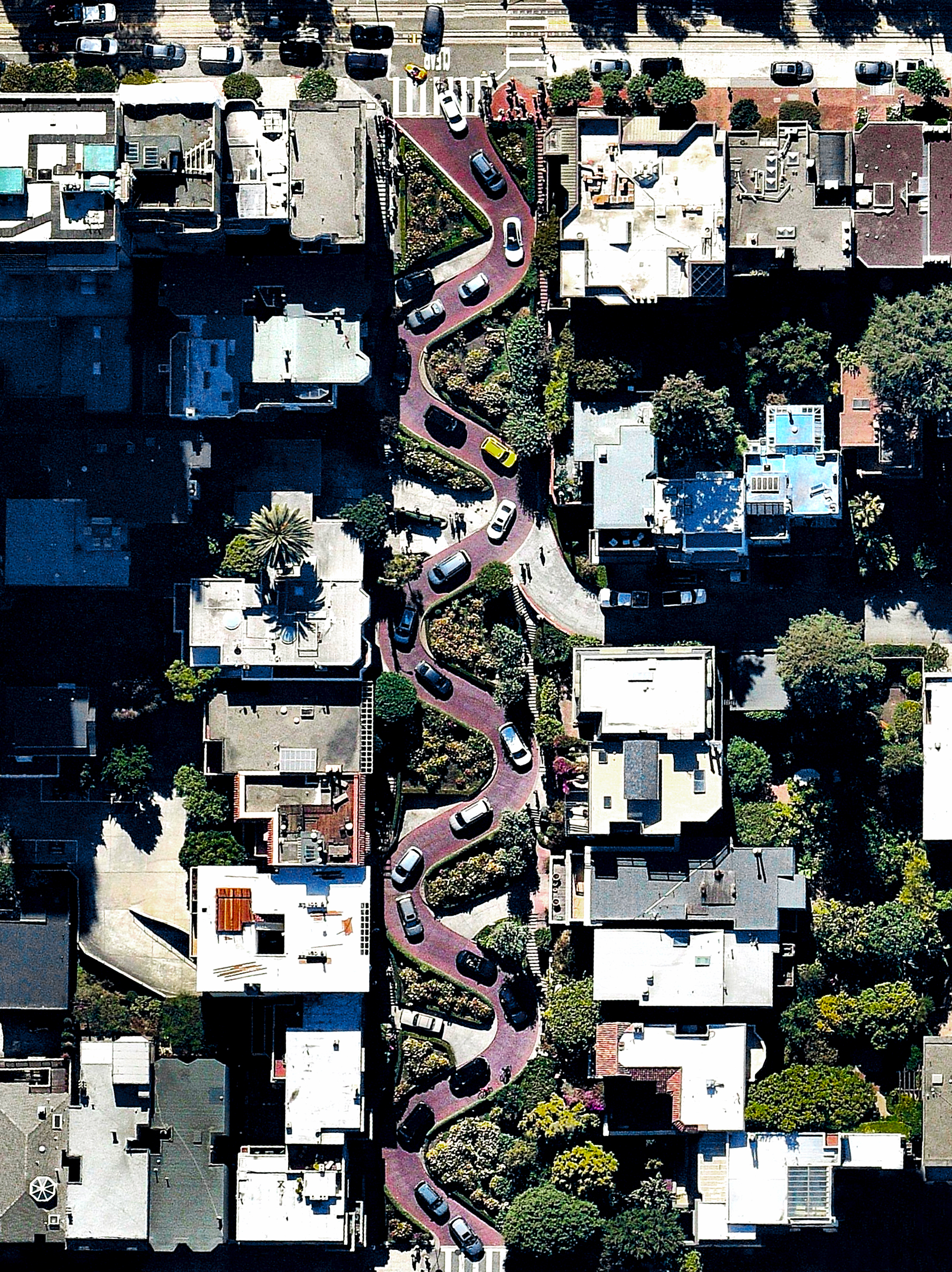 Cars wind down the hill of Lombard Street in San Francisco, California. With eight hairpin turns dispersed over a one-block section in the Russian Hill neighborhood, Lombard is often referred to as “the most crooked street in the world.” It is a major tourist attraction, receiving as many as 17,000 visitors per day on busy summer weekends.