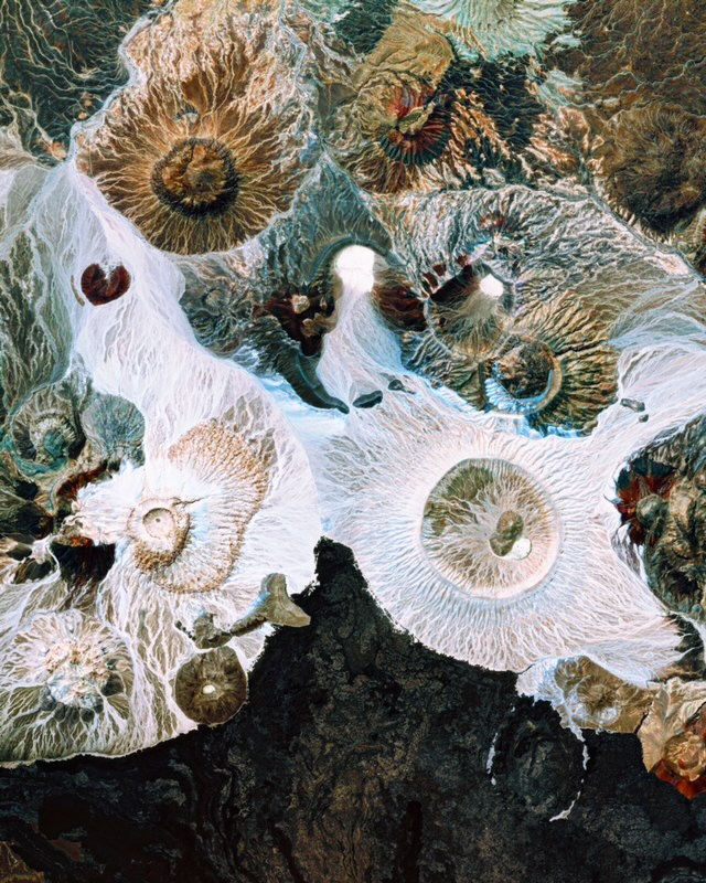 Volcanic craters cover the landscape in Harrat Khaybar, a lava field in Saudi Arabia. Formed by a series of eruptions over 5 million years, the Harrat covers an area of more than 4,600 square miles (12,000 square km). In the bottom right of this Overview is White Mountain, a geological rarity which gets its pale color from a huge volcanic explosion that emitted gases and white ash containing silicon.