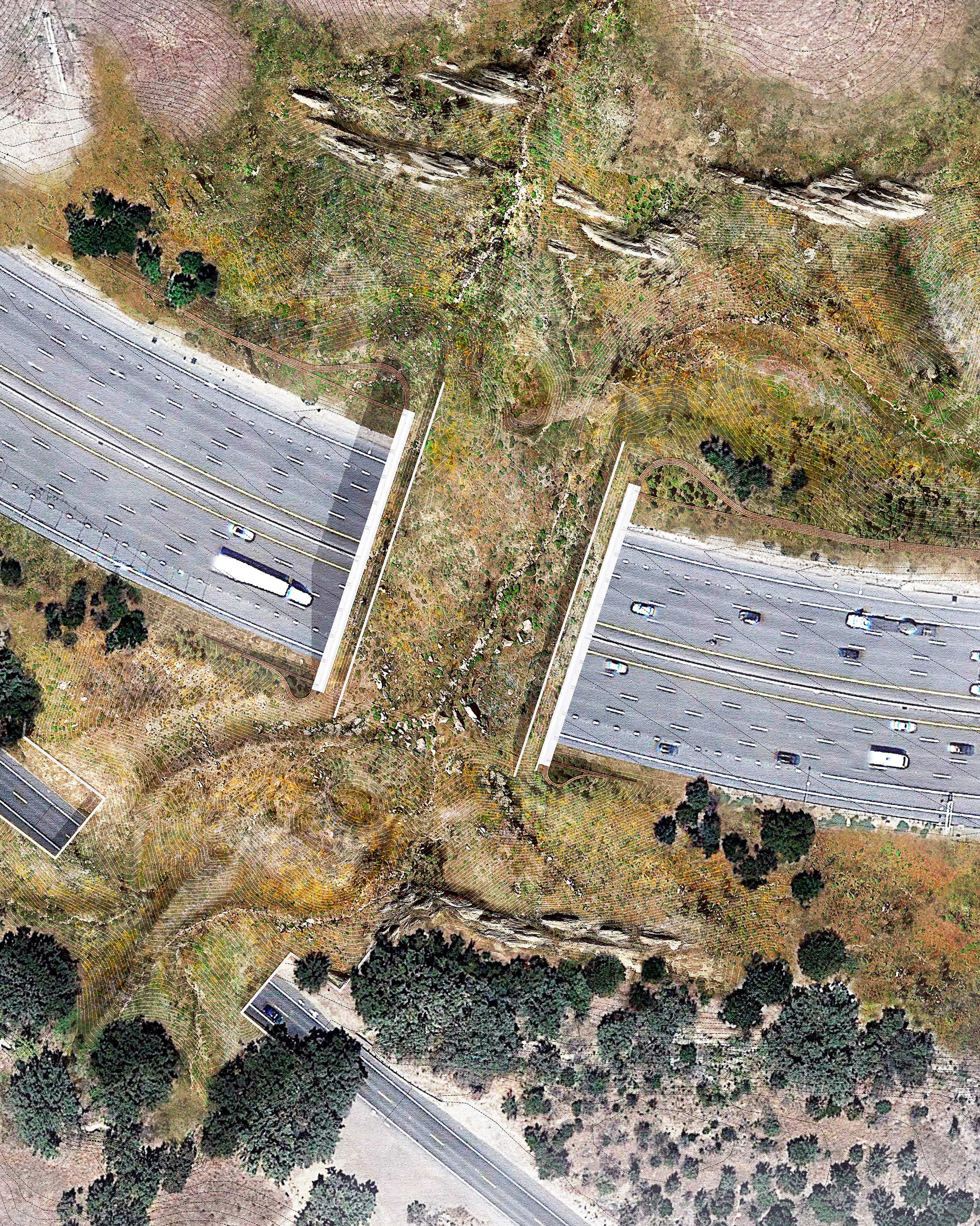 The Wallis Annenberg Wildlife Crossing will be the world’s largest wildlife overpass when it’s completed around 2025. Constructed across the Ventura Freeway near Los Angeles, California, the 200-foot-long (61-meter), 165-foot-wide (50-meter) corridor will provide safe crossing for mountain lions and other animals, using vegetation and walls to block light and noise from vehicles. Construction broke ground on Earth Day of this year and this rendering uses satellite imagery to show the planned, finished look of the corridor.