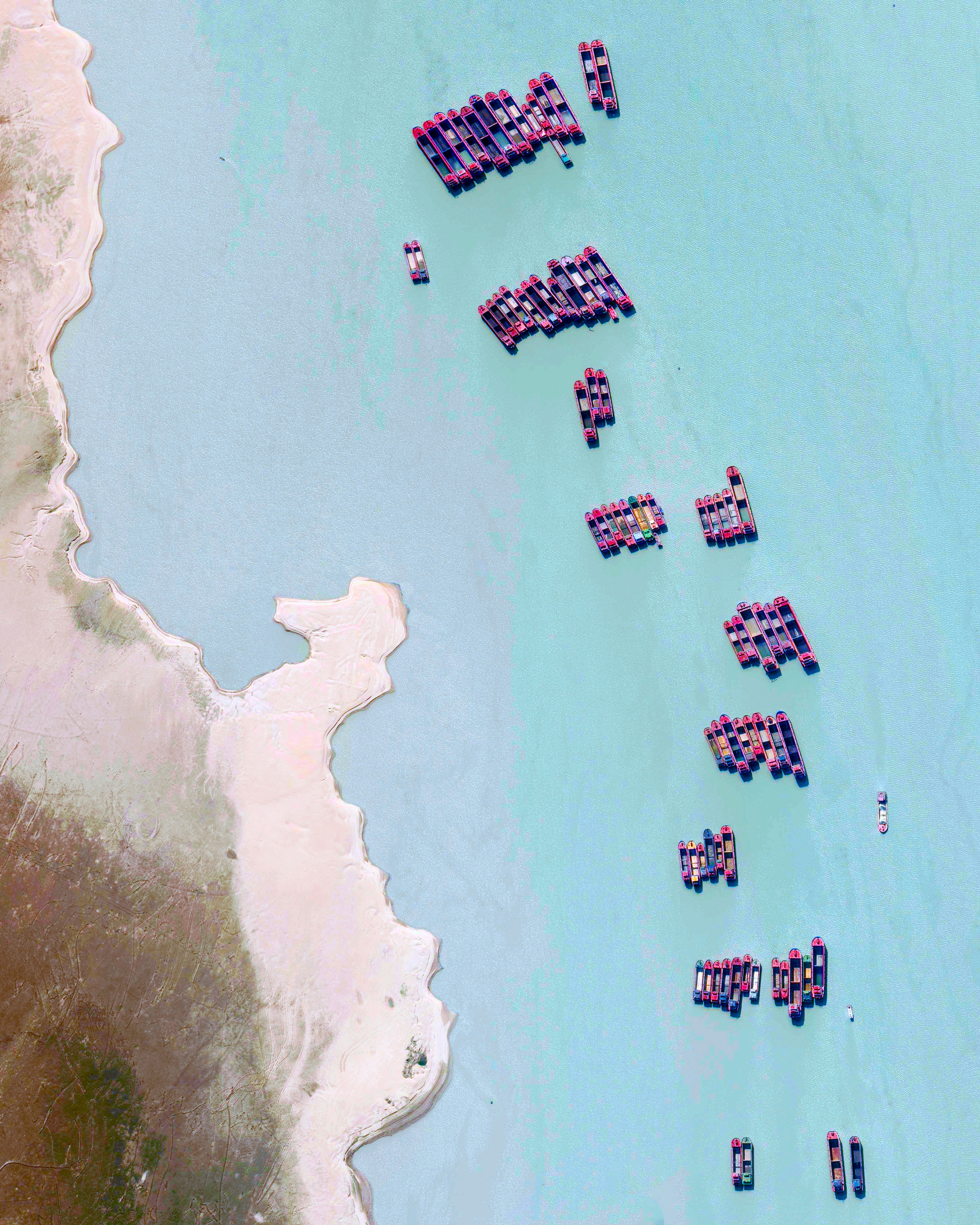 Sand dredging boats gather on Poyang Lake in China’s Jiangxi Province, one of the world’s busiest dredging sites. On an average day here, hundreds of vessels can collect upwards of 10,000 tonnes of sand per hour, much of which is used in land reclamation projects. Poyang is China’s largest lake, but it is losing water fast — its outflow channels have been carved deeper and wider by dredging. This Overview is featured in our newest story ‘Dredging Up Problems,’ which takes a look at land reclamation and it’s impact on our environment.Read the full story →