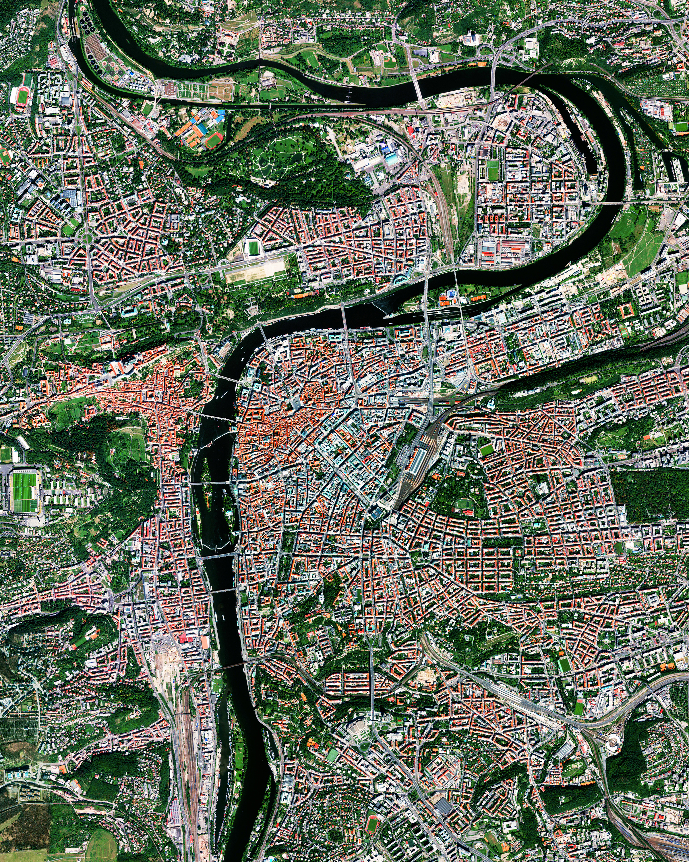 Prague is the capital and largest city in the Czech Republic, with an estimated 2.7 million people living in its metropolitan area. Founded in the 7th century during the Romanesque period and flourishing throughout the Gothic, Renaissance and Baroque eras, the city is a rich cultural hub of central Europe. This Overview shows the Vltava River winding through Prague’s city center.