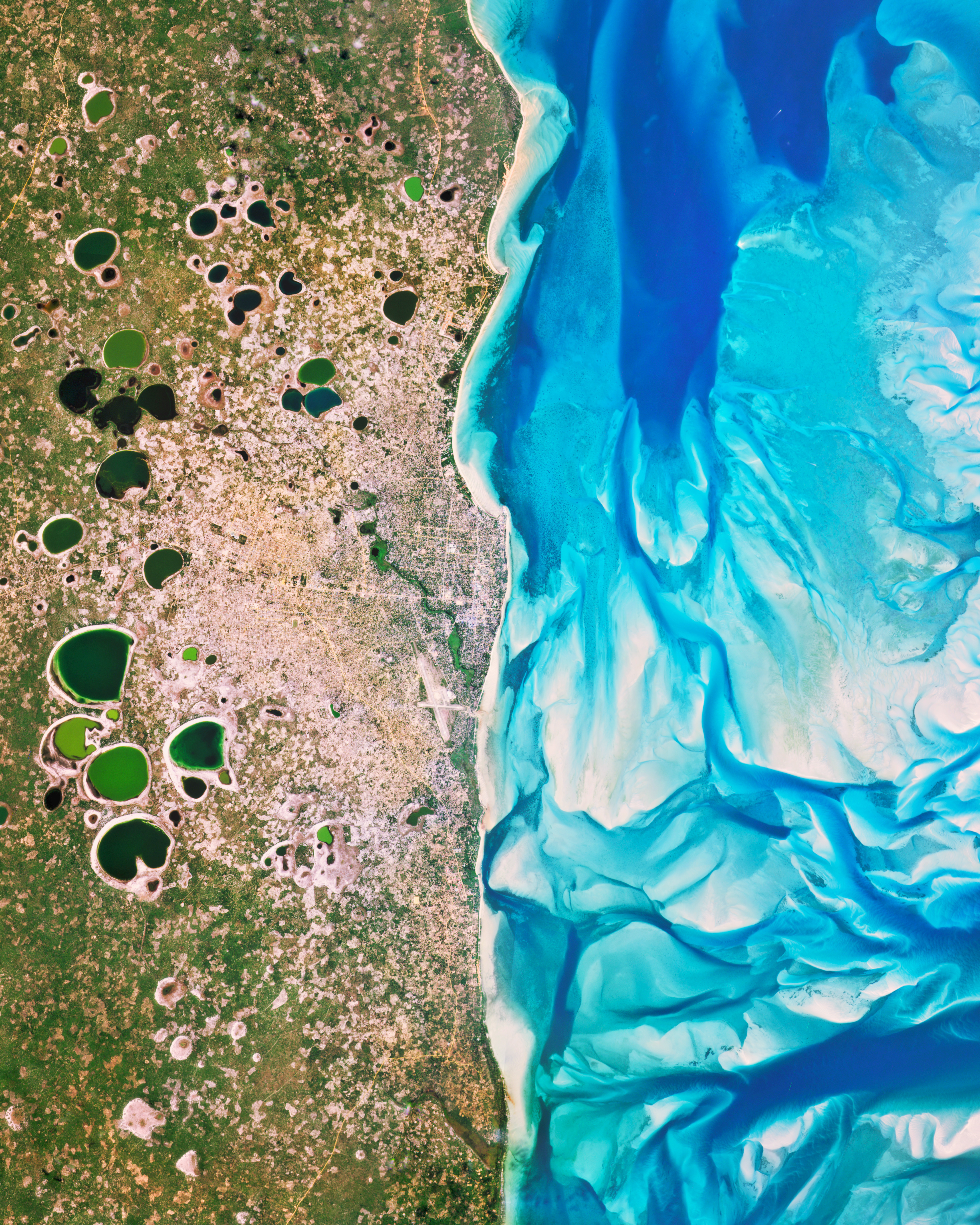 Bright blue swirls of sea floor can be seen through the shallow waters offshore Vilankulo, Mozambique. These interesting patterns were formed by the Save River, which used to drain into the ocean nearby but has since changed its course. Home to about 25,000 people, the coastal town of Vilankulo is surrounded by numerous round lakes, which are also remnants of the river’s former path.